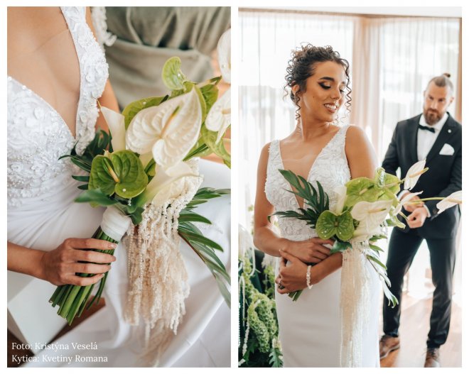 Kytica spájajúca dve výrazné kvetinové línie, exotické anthurium a nadčasové kaly, do aranžmánu, ktorý pôsobí sviežo, luxusne a zároveň moderne. Kombinácia lesklých antúrií v zeleno-bielych tónoch so smotanovými kalami vytvára elegantný kontrast tvarov aj textúr.