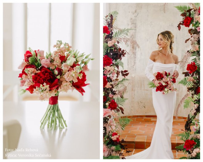 Táto kytica je dôkazom, že červená nikdy nevyjde z módy. Kombinuje zamatové pivonky, jemné ruže a textúrované pastelové kvety do bohatej kompozície, ktorá pôsobí romanticky, dramaticky a žensky. Intenzívne odtiene červenej – od vínovej po karmínovú – dominovali v mnohých tohtoročných kyticiach. Ideálna voľba pre nevesty, ktoré sa neboja farieb, chcú zaujať a vyjadriť svoju vášeň aj jemnosť v jednom geste.