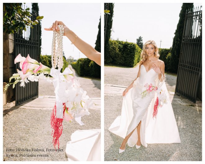 Perly už dávno nie sú len výsadou šperkov – dnes s gráciou vstupujú aj do sveta svadobných kytíc, kde zohrávajú viac než len dekoratívnu úlohu. Jemne obopínajú stonky alebo vytvárajú pôsobivé akcenty priamo na kvetoch, čím celú kompozíciu povyšujú na šperk v rukách nevesty. Spojenie kvetov a perál je jedným z najsilnejších trendov roka. Tento štýl je ideálny pre nevesty, ktoré túžia po výraznom, nezvyčajnom prvku a chcú, aby sa kytica stala „statement“ doplnkom celého vzhľadu. Perlové motívy zároveň krásne kontrastujú s minimalistickými šatami z hladkých materiálov.